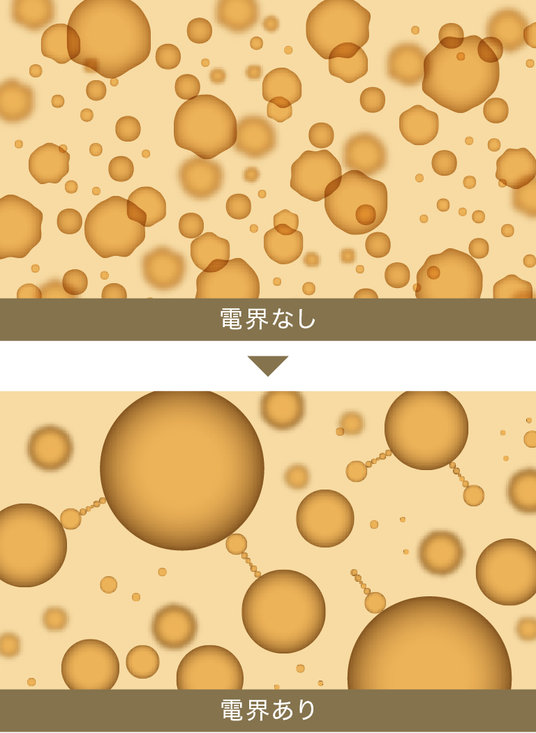 上図の電界がかかっていない状態では、水の粒同士は連ならず、くっついていくのに対し、下図の電界がかかった状態では水の粒が連珠のように連なっていきます。